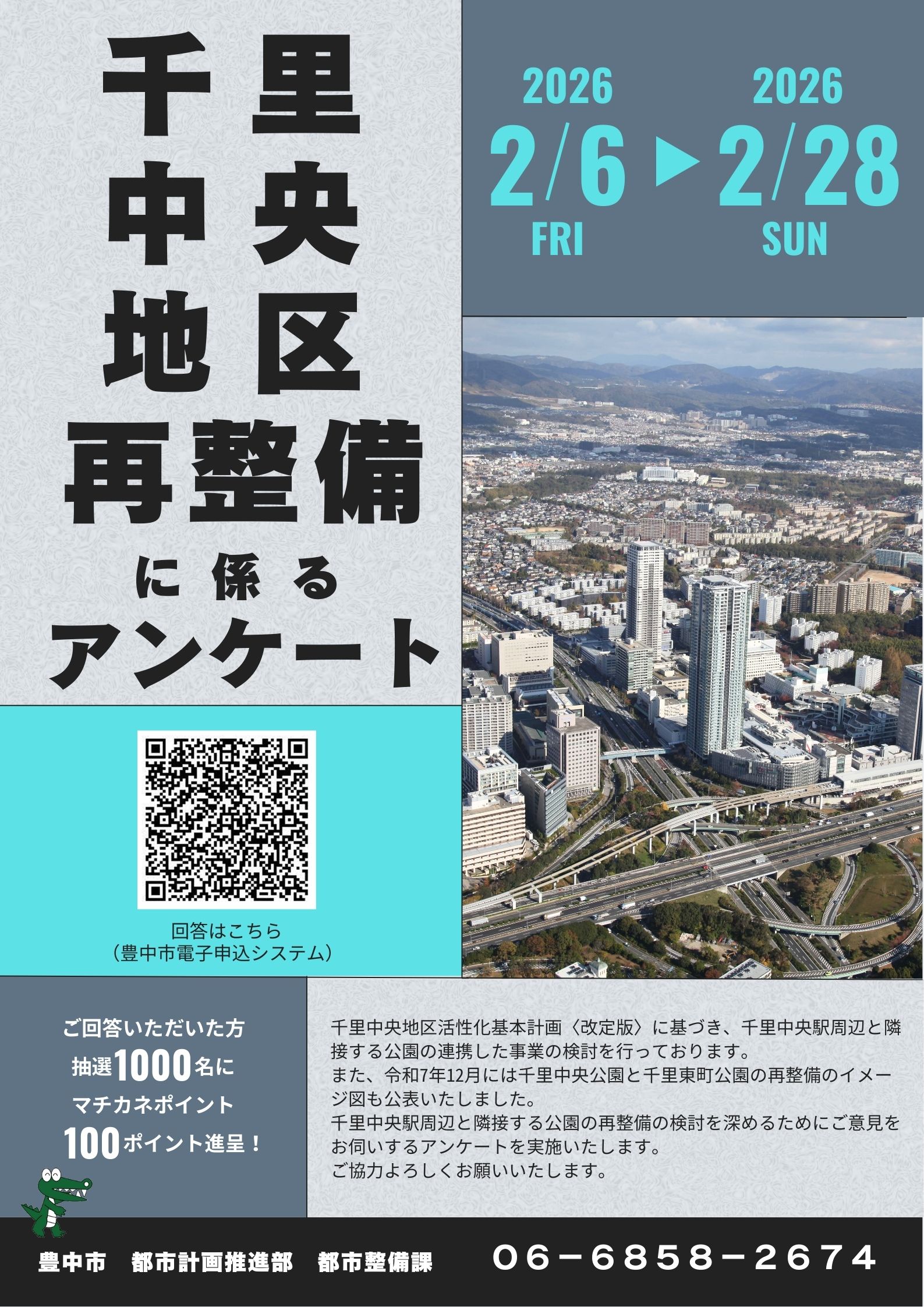 千里中央地区活性化基本計画〈改定版〉に基づき、千里中央駅周辺と隣接する公園の連携した事業の検討を行っております。また、令和7年12月には千里中央公園と千里東町公園の再整備のイメージ図も公表いたしました。 千里中央駅周辺と隣接する公園の再整備の検討を深めるためにご意見をお伺いするアンケートを実施いたします。 ご協力よろしくお願いいたします。
