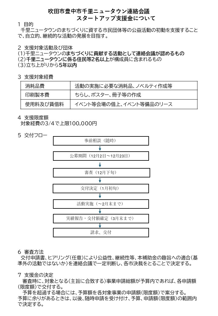 吹田市・豊中市千里ニュータウン連絡会議では千里ニュータウンに関わる住民等が、自ら主体的に参加し、千里ニュータウンの活性化に資する活動を行うとともに、自立的かつ継続的に発展していくことを目的とし、まちづくり活動のスタートアップを支援します。まちづくり活動に興味がある方は是非ご応募ください。