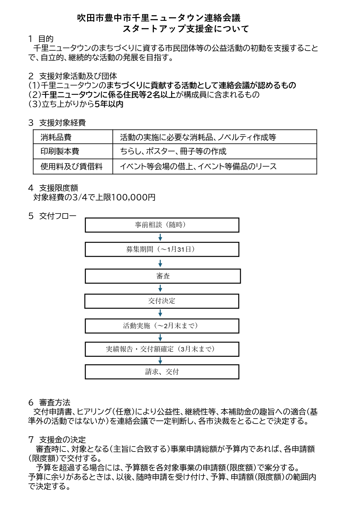 吹田市・豊中市千里ニュータウン連絡会議では千里ニュータウンに関わる住民等が、自ら主体的に参加し、千里ニュータウンの活性化に資する活動を行うとともに、自立的かつ継続的に発展していくことを目的とし、まちづくり活動のスタートアップを支援します。